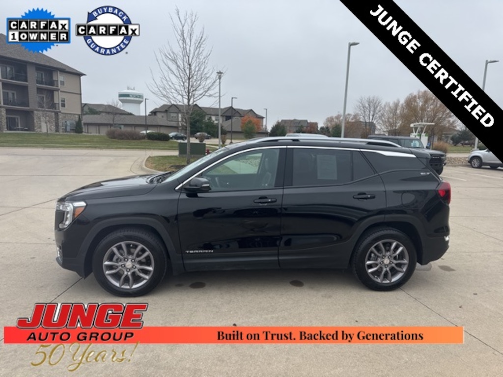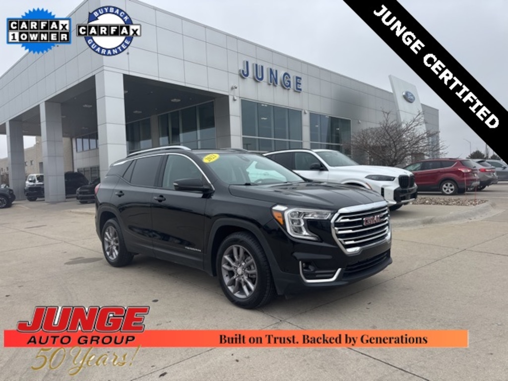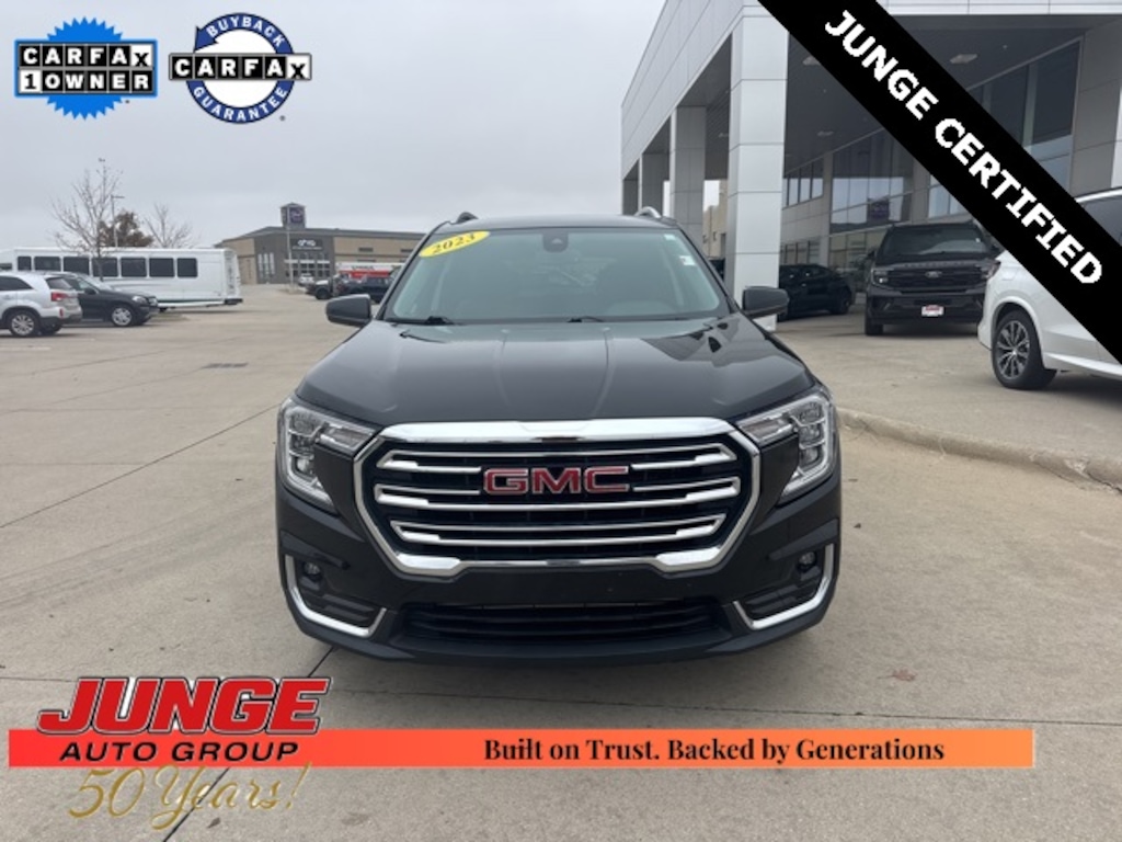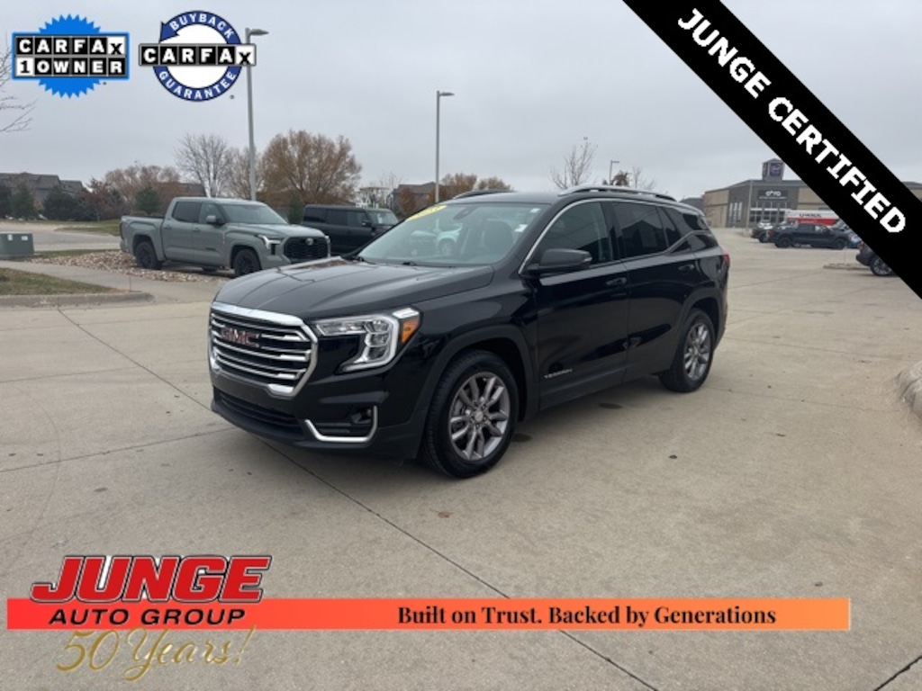 **LOCAL TRADE**, **JUNGE PRE-OWNED ADVANTAGE**, Junge Certification Certified, Adaptive Cruise Control, Floor Liner Package (LPO), Front & Rear All-Weather Floor Liners (LPO), Integrated Cargo Liner (LPO), Preferred Equipment Group 4SA, Rear Park Assist, Safety Alert Seat, Terrain Pro Safety Plus, 2 USB Data Ports, 2 USB Data Ports w/SD Card Reader, 3.47 Axle Ratio, 4-Wheel Disc Brakes, 6 Speakers, 6-Speaker Audio System Feature, 6-Way Power Front Passenger Seat, 8-Way Power Driver Seat Adjuster, ABS brakes, Air Conditioning, Alloy wheels, AM/FM radio: SiriusXM, Auto High-beam Headlights, Auto-dimming Rear-View mirror, Automatic temperature control, Bluetooth® For Phone, Brake assist, Bumpers: body-color, Compass, Delay-off headlights, Driver & Front Passenger Heated Seats, Driver door bin, Driver vanity mirror, Dual front impact airbags, Dual front side impact airbags, Electronic Stability Control, Emergency communication system: OnStar and GMC connected services capable, Four wheel independent suspension, Front anti-roll bar, Front Bucket Seats, Front Center Armrest, Front dual zone A/C, Front fog lights, Front Passenger 2-Way Power Lumbar, Front reading lights, Fully automatic headlights, Garage door transmitter, Heated door mirrors, Heated front seats, Heated steering wheel, Illuminated entry, Low tire pressure warning, Memory seat, Occupant sensing airbag, Outside temperature display, Overhead airbag, Overhead console, Panic alarm, Passenger door bin, Passenger vanity mirror, Perforated Leather-Appointed Seat Trim, Power door mirrors, Power Driver Lumbar Control, Power driver seat, Power Liftgate, Power passenger seat, Power steering, Power windows, Radio data system, Radio: GMC Infotainment Audio System w/8" Display, Rear anti-roll bar, Rear seat center armrest, Rear window defroster, Rear window wiper, Remote keyless entry, Roof rack: rails only, Security system, SiriusXM Radio, Speed control, Speed-sensing steering, Split folding rear seat, Spoiler, Steering wheel mounted audio controls, Tachometer, Telescoping steering wheel, Tilt steering wheel, Traction control, Trip computer, Turn signal indicator mirrors, Variably intermittent wipers, Wheels: 18" x 7" Silver Painted Aluminum, Wireless Apple CarPlay/Wireless Android Auto, Adaptive Cruise Control, Floor Liner Package (LPO), Front & Rear All-Weather Floor Liners (LPO), Integrated Cargo Liner (LPO), Preferred Equipment Group 4SA, Rear Park Assist, Safety Alert Seat, Terrain Pro Safety Plus.