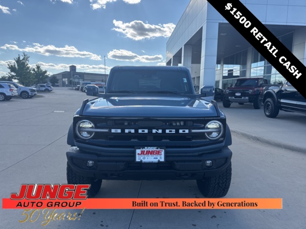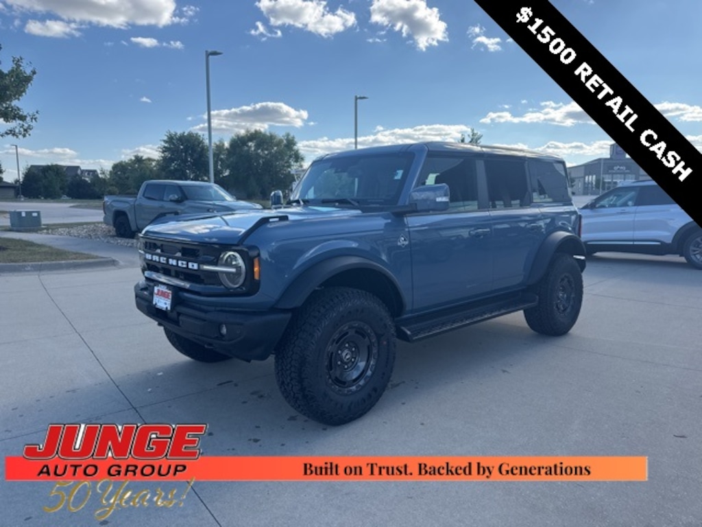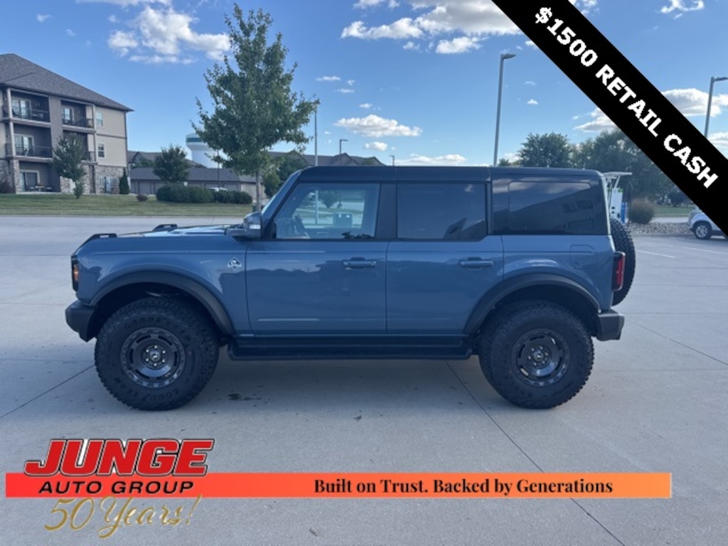 2025 Azure Gray Metallic Tri-Coat Ford Bronco 360-Degree Camera, 4-Wheel Disc Brakes, 4.7 Final Drive Ratio, 7 Speakers, ABS brakes, Adaptive Cruise Control, Air Conditioning, Alloy wheels, AM/FM radio: SiriusXM with 360L, AM/FM Stereo, Auto High-beam Headlights, Auto-dimming Rear-View mirror, Automatic temperature control, Brake assist, Compass, Connected Navigation, Delay-off headlights, Driver door bin, Driver vanity mirror, Dual front impact airbags, Dual front side impact airbags, Electronic Stability Control, Emergency communication system: 911 Assist, Equipment Group 314A Lux Package, Evasive Steering Assist, Exterior Parking Camera Rear, Front anti-roll bar, Front Bucket Seats, Front Center Armrest, Front dual zone A/C, Front fog lights, Front License Plate Bracket, Front Parking Sensors, Front reading lights, Front wheel independent suspension, Fully automatic headlights, Hard Top Sound Deadening Headliner, Heated door mirrors, Heated front seats, Heated Leather-Trimmed/Vinyl Bucket Seats, Heated steering wheel, High Clearance Fender Flares, High Clearance Suspension, Illuminated entry, Information on Demand Panel, Integrated roll-over protection, Leather Shift Knob, Low tire pressure warning, Navigation system: Connected Navigation, Occupant sensing airbag, Outside temperature display, Overhead airbag, Overhead console, Panic alarm, Passenger door bin, Passenger vanity mirror, Position-Sensitive Bilstein Shock Absorbers, Power door mirrors, Power driver seat, Power passenger seat, Power steering, Power windows, Radio data system, Radio: B&O Sound System by Bang & Olufsen, Rear seat center armrest, Rear-Window Defroster & Washer, Remote keyless entry, Sasquatch Package, Security system, Shadow Black-Painted Hard Top, Sideview Mirrors, SiriusXM w/360L, Speed control, Split folding rear seat, Steering wheel mounted audio controls, SYNC 4, Tachometer, Telescoping steering wheel, Tilt steering wheel, Traction control, Trip computer, Universal Garage Door Opener, Variably intermittent wipers, Voltmeter, 360-Degree Camera, 4-Wheel Disc Brakes, 4.7 Final Drive Ratio, 7 Speakers, ABS brakes, Adaptive Cruise Control, Air Conditioning, Alloy wheels, AM/FM radio: SiriusXM with 360L, AM/FM Stereo, Auto High-beam Headlights, Auto-dimming Rear-View mirror, Automatic temperature control, Brake assist, Compass, Connected Navigation, Delay-off headlights, Driver door bin, Driver vanity mirror, Dual front impact airbags, Dual front side impact airbags, Electronic Stability Control, Emergency communication system: 911 Assist, Equipment Group 314A Lux Package, Evasive Steering Assist, Exterior Parking Camera Rear, Front anti-roll bar, Front Bucket Seats, Front Center Armrest, Front dual zone A/C, Front fog lights, Front License Plate Bracket, Front Parking Sensors, Front reading lights, Front wheel independent suspension, Fully automatic headlights, Hard Top Sound Deadening Headliner, Heated door mirrors, Heated front seats, Heated Leather-Trimmed/Vinyl Bucket Seats, Heated steering wheel, High Clearance Fender Flares, High Clearance Suspension, Illuminated entry, Information on Demand Panel, Integrated roll-over protection, Leather Shift Knob, Low tire pressure warning, Navigation system: Connected Navigation, Occupant sensing airbag, Outside temperature display, Overhead airbag, Overhead console, Panic alarm, Passenger door bin, Passenger vanity mirror, Position-Sensitive Bilstein Shock Absorbers, Power door mirrors, Power driver seat, Power passenger seat, Power steering, Power windows, Radio data system, Radio: B&O Sound System by Bang & Olufsen, Rear seat center armrest, Rear-Window Defroster & Washer, Remote keyless entry, Sasquatch Package, Security system, Shadow Black-Painted Hard Top, Sideview Mirrors, SiriusXM w/360L, Speed control, Split folding rear seat, Steering wheel mounted audio controls, SYNC 4, Tachometer, Telescoping steering wheel, Tilt steering wheel, Traction control, Trip computer, Universal Garage Door Opene