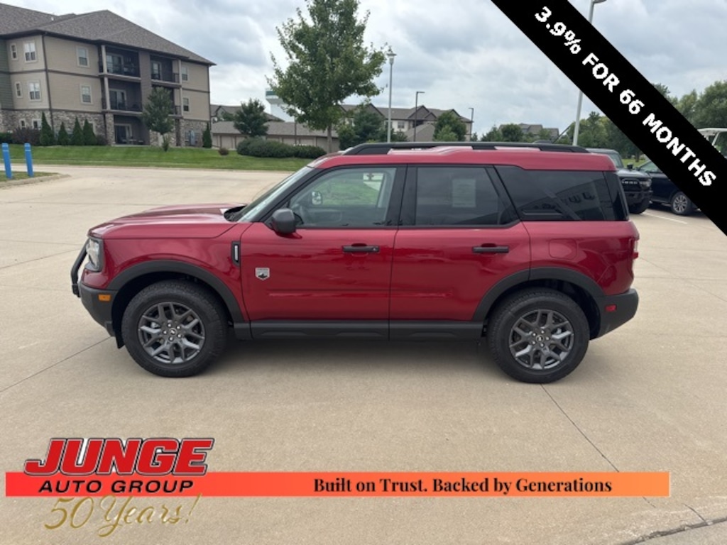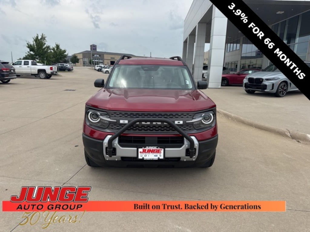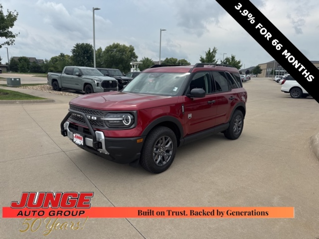 2025 Ruby Red Metallic Tinted Clearcoat Ford Bronco Sport **4WD**, 110V/400W AC Power Outlet, 2nd Row Carpeted Seatback, Auxiliary Switches & Wiring, Black Diamond Off-Road Package, Brush Guard, Cargo Management System (Shelf/Divider/Table), Cargo Mat, Class II Trailer Tow Pack w/Trailer Sway Control, Equipment Group 200A, Fender Tie Downs, Front & Rear Black Bumpers, Interior Grab Handle, Recovery Hooks, Wheels: 17" Carbonized Gray Painted Aluminum, 4-Wheel Disc Brakes, 6 Speakers, ABS brakes, Air Conditioning, Alloy wheels, AM/FM radio: SiriusXM, AM/FM Stereo, Auto High-beam Headlights, Automatic temperature control, Brake assist, Cloth w/Easy-to-Clean Front Bucket Seats, Compass, Delay-off headlights, Driver door bin, Driver vanity mirror, Dual front impact airbags, Dual front side impact airbags, Electronic Stability Control, Emergency communication system: SYNC 4 911 Assist, Four wheel independent suspension, Front anti-roll bar, Front Bucket Seats, Front Center Armrest, Front License Plate Bracket, Front reading lights, Fully automatic headlights, Heated door mirrors, Illuminated entry, Knee airbag, Low tire pressure warning, Occupant sensing airbag, Outside temperature display, Overhead airbag, Overhead console, Panic alarm, Passenger door bin, Passenger vanity mirror, Power door mirrors, Power steering, Power windows, Radio data system, Rear anti-roll bar, Rear Parking Sensors, Rear reading lights, Rear seat center armrest, Rear window defroster, Rear window wiper, Remote keyless entry, Security system, SiriusXM, Speed control, Speed-sensing steering, Speed-Sensitive Wipers, Split folding rear seat, Steering wheel mounted audio controls, SYNC 4 w/Enhanced Voice Recognition, Tachometer, Telescoping steering wheel, Tilt steering wheel, Traction control, Trip computer, Variably intermittent wipers, Wheels: 17" Carbonized Gray-Painted Aluminum, 110V/400W AC Power Outlet, 2nd Row Carpeted Seatback, Auxiliary Switches & Wiring, Black Diamond Off-Road Package, Brush Guard, Cargo Management System (Shelf/Divider/Table), Cargo Mat, Class II Trailer Tow Pack w/Trailer Sway Control, Equipment Group 200A, Fender Tie Downs, Front & Rear Black Bumpers, Interior Grab Handle, Recovery Hooks, Wheels: 17" Carbonized Gray Painted Aluminum.
