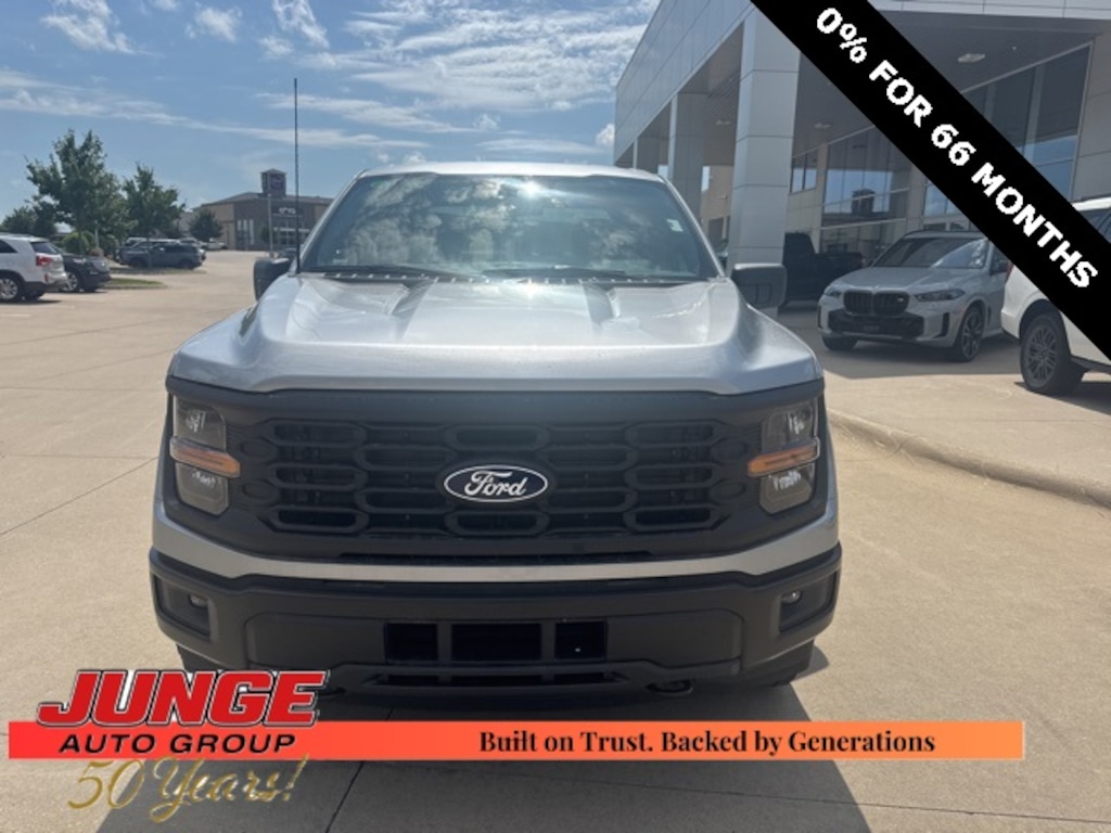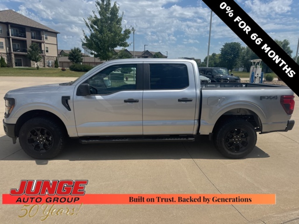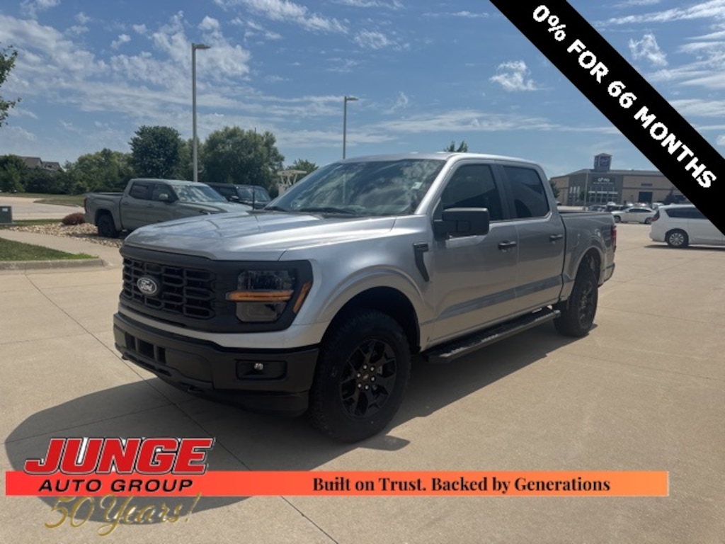 2025 Iconic Silver Metallic Ford F-150 **CREW CAB**, **4WD**, 4WD, 3.55 Axle Ratio, 4-Wheel Disc Brakes, 6 Speakers, 6" Black Running Boards, ABS brakes, Air Conditioning, Alloy wheels, Argent Front/Rear Bumper, Auto High-beam Headlights, Brake assist, Bumpers: body-color, Compass, Delay-off headlights, Driver door bin, Dual Exhaust w/Black Tips, Dual front impact airbags, Dual front side impact airbags, Electronic Stability Control, Emergency communication system: SYNC 4 911 Assist, Equipment Group 201A FX4, Front anti-roll bar, Front Bucket Seats, Front Center Armrest, Front License Plate Bracket, Front reading lights, Front wheel independent suspension, Fully automatic headlights, FX4 Box Decal, GVWR: 6,650 lbs Payload Package, Heated door mirrors, Illuminated entry, Low tire pressure warning, Monotube Rear Shocks, Occupant sensing airbag, Off-Road Tuned Front Shock Absorbers, Outside temperature display, Overhead airbag, Overhead console, Panic alarm, Passenger door bin, Passenger vanity mirror, Power door mirrors, Power steering, Power windows, Radio data system, Rear Parking Sensors, Rear step bumper, Rear window defroster, Remote keyless entry, Security system, Speed control, Split folding rear seat, Steering wheel mounted audio controls, STX Badge in Fender Vent, SYNC 4 w/Enhanced Voice Recognition, Tachometer, Telescoping steering wheel, Tilt steering wheel, Traction control, Tray Style Floor Liner, Trip computer, Unique Cloth 40/Console/40 Front Seats, Variably intermittent wipers, Voltmeter, Wheels: 18" Black Painted Aluminum.