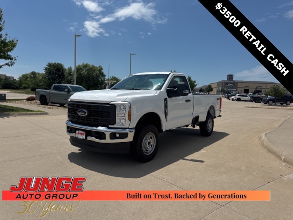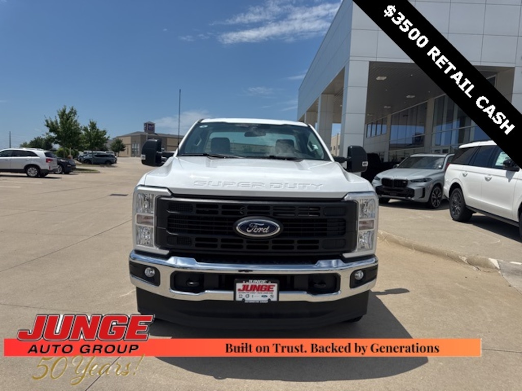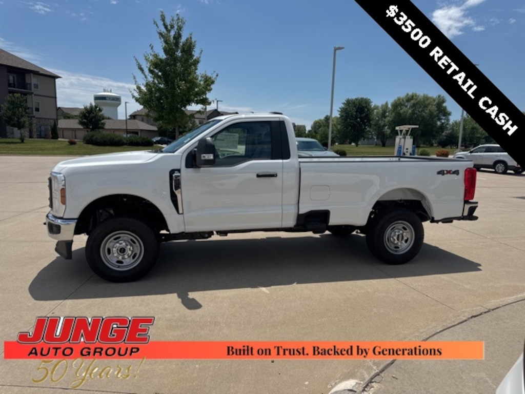 2025 Oxford White Ford F-250SD **4WD**, 4WD, 250 Amp Alternator (Gas), 4 Speakers, 4-Wheel Disc Brakes, ABS brakes, Air Conditioning, AM/FM radio, AM/FM Stereo w/MP3 Player, Brake assist, Compass, Delay-off headlights, Dual front impact airbags, Dual front side impact airbags, Electronic Stability Control, Electronic-Locking w/3.73 Axle Ratio, Emergency communication system: SYNC 4 911 Assist, Exterior Parking Camera Rear, F-250 >10K GVWR Package, Front anti-roll bar, Front Center Armrest w/Storage, Front License Plate Bracket, Front reading lights, Fully automatic headlights, GVWR: 10,000 lb Payload Package, Heated door mirrors, Illuminated entry, Low tire pressure warning, Outside temperature display, Overhead airbag, Overhead console, Panic alarm, Passenger cancellable airbag, Passenger vanity mirror, Power door mirrors, Power steering, Power windows, Rear Stabilizer Bar & Auxiliary Springs, Rear step bumper, Remote keyless entry, Security system, Snow Plow/Camper Package, Speed control, Steering wheel mounted audio controls, SYNC 4, Tachometer, Telescoping steering wheel, Tilt steering wheel, Traction control, Trip computer, Turn signal indicator mirrors, Upfitter Switches (6), Variably intermittent wipers.