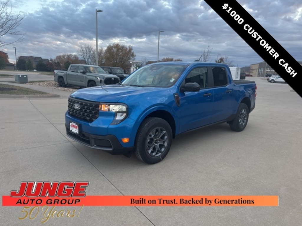 2025 Velocity Blue Ford Maverick **CREW CAB**, **AWD**, 400W Inverter w/USB Console Rear, Equipment Group 302A, Heated Mirror w/Painted Black Skull Caps, Heated Seats, LED Box Lighting, Remote Start System, Soft Vinyl Wrapped Heated Steering Wheel, XLT Luxury Package, 2.91 Axle Ratio, 4-Wheel Disc Brakes, 6 Speakers, ABS brakes, Air Conditioning, Alloy wheels, AM/FM radio: SiriusXM with 360L, Apple CarPlay/Android Auto, Auto High Beams, Auto High-beam Headlights, Automatic temperature control, Brake assist, Bumpers: body-color, Compass, Delay-off headlights, Driver door bin, Driver vanity mirror, Dual front impact airbags, Dual front side impact airbags, Electronic Stability Control, Emergency communication system: SYNC 4 911 Assist, Exterior Parking Camera Rear, Four wheel independent suspension, Front anti-roll bar, Front Bucket Seats, Front Center Armrest, Front reading lights, Fully automatic headlights, Illuminated entry, Knee airbag, Low tire pressure warning, Occupant sensing airbag, Outside temperature display, Overhead airbag, Overhead console, Panic alarm, Passenger door bin, Passenger vanity mirror, Power door mirrors, Power steering, Power windows, Pre-Collision Assist w/Automatic Emergency Braking, Radio data system, Radio: AM/FM Stereo w/6 Speakers, Rear anti-roll bar, Rear seat center armrest, Rear step bumper, Rear-View Camera, Remote keyless entry, Security system, SiriusXM w/360L, Speed control, Speed-sensing steering, Steering wheel mounted audio controls, SYNC 4 w/Enhanced Voice Recognition, Telescoping steering wheel, Tilt steering wheel, Traction control, Trip computer, Unique Cloth Front Bucket Seats, Wheels: 17" Carbonized Gray Painted Aluminum, 400W Inverter w/USB Console Rear, Equipment Group 302A, Heated Mirror w/Painted Black Skull Caps, Heated Seats, LED Box Lighting, Remote Start System, Soft Vinyl Wrapped Heated Steering Wheel, XLT Luxury Package.