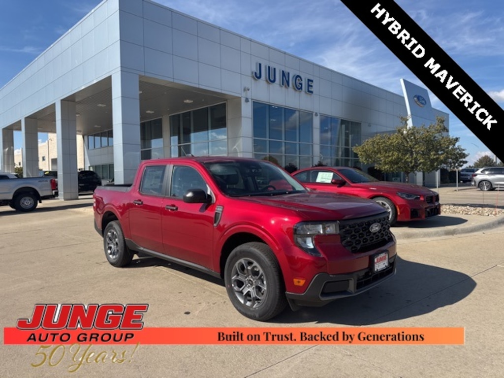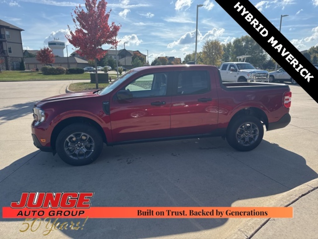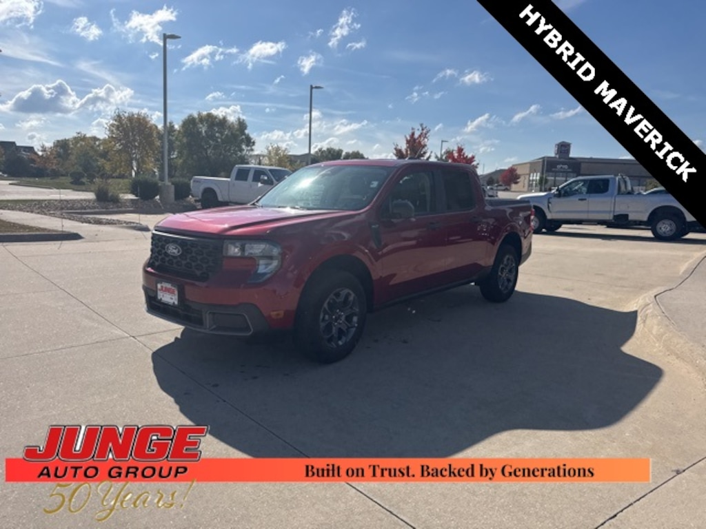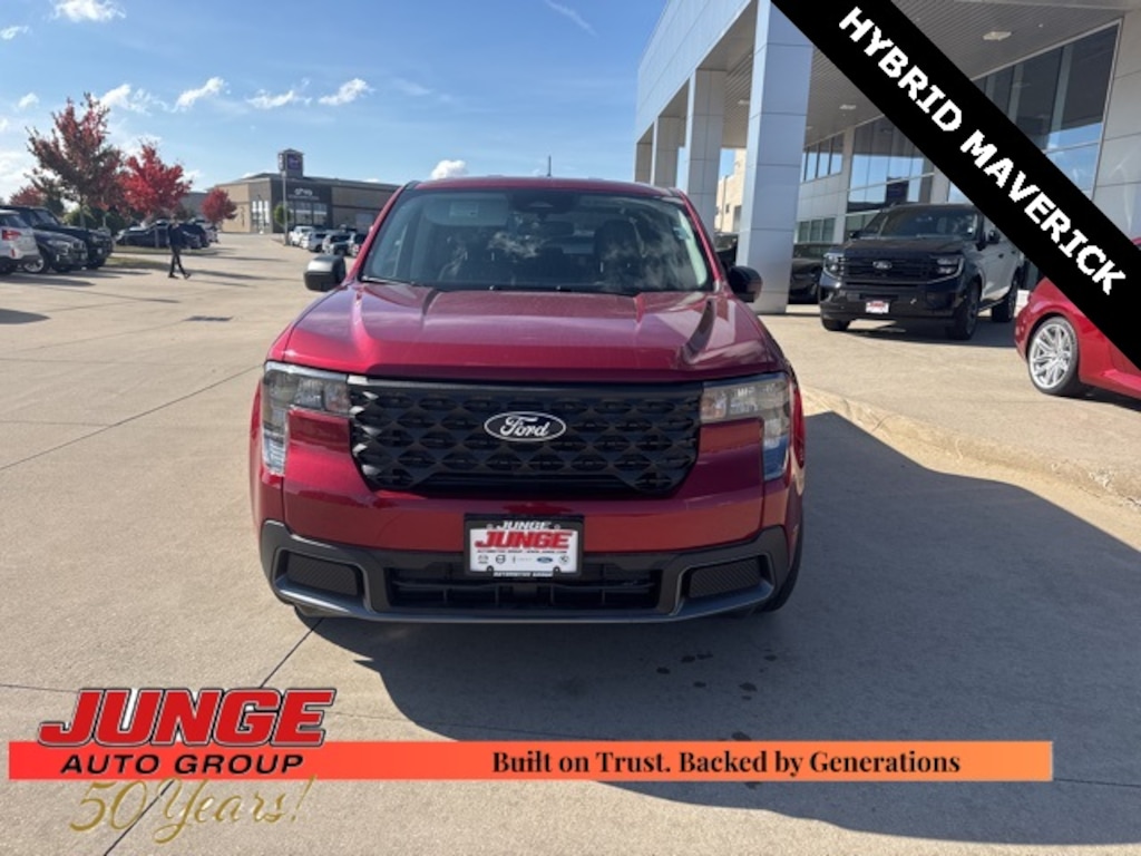 2025 Ruby Red Metallic Tinted Clearcoat Ford Maverick **CREW CAB**, **AWD**, 2.5L I-4 Hybrid, 4-Wheel Disc Brakes, 6 Speakers, ABS brakes, Air Conditioning, Alloy wheels, AM/FM radio: SiriusXM with 360L, Apple CarPlay/Android Auto, Auto High Beams, Auto High-beam Headlights, Automatic temperature control, Brake assist, Bumpers: body-color, Compass, Delay-off headlights, Driver door bin, Driver vanity mirror, Dual front impact airbags, Dual front side impact airbags, Electronic Stability Control, Emergency communication system: SYNC 4 911 Assist, Equipment Group 301A, Exterior Parking Camera Rear, Four wheel independent suspension, Front Bucket Seats, Front Center Armrest, Front reading lights, Fully automatic headlights, Illuminated entry, Knee airbag, Low tire pressure warning, Occupant sensing airbag, Outside temperature display, Overhead airbag, Overhead console, Panic alarm, Passenger door bin, Passenger vanity mirror, Power door mirrors, Power steering, Power windows, Pre-Collision Assist w/Automatic Emergency Braking, Radio data system, Radio: AM/FM Stereo w/6 Speakers, Rear anti-roll bar, Rear seat center armrest, Rear step bumper, Rear-View Camera, Remote keyless entry, Security system, SiriusXM w/360L, Speed control, Speed-sensing steering, Steering wheel mounted audio controls, SYNC 4 w/Enhanced Voice Recognition, Telescoping steering wheel, Tilt steering wheel, Traction control, Trip computer, Unique Cloth Front Bucket Seats, Wheels: 17" Carbonized Gray Painted Aluminum, 2.91 Axle Ratio, Front anti-roll bar, 2.5L I-4 Hybrid, 4-Wheel Disc Brakes, 6 Speakers, ABS brakes, Air Conditioning, Alloy wheels, AM/FM radio: SiriusXM with 360L, Apple CarPlay/Android Auto, Auto High Beams, Auto High-beam Headlights, Automatic temperature control, Brake assist, Bumpers: body-color, Compass, Delay-off headlights, Driver door bin, Driver vanity mirror, Dual front impact airbags, Dual front side impact airbags, Electronic Stability Control, Emergency communication system: SYNC 4 911 Assist, Equipment Group 301A, Exterior Parking Camera Rear, Four wheel independent suspension, Front Bucket Seats, Front Center Armrest, Front reading lights, Fully automatic headlights, Illuminated entry, Knee airbag, Low tire pressure warning, Occupant sensing airbag, Outside temperature display, Overhead airbag, Overhead console, Panic alarm, Passenger door bin, Passenger vanity mirror, Power door mirrors, Power steering, Power windows, Pre-Collision Assist w/Automatic Emergency Braking, Radio data system, Radio: AM/FM Stereo w/6 Speakers, Rear anti-roll bar, Rear seat center armrest, Rear step bumper, Rear-View Camera, Remote keyless entry, Security system, SiriusXM w/360L, Speed control, Speed-sensing steering, Steering wheel mounted audio controls, SYNC 4 w/Enhanced Voice Recognition, Telescoping steering wheel, Tilt steering wheel, Traction control, Trip computer, Unique Cloth Front Bucket Seats, Wheels: 17" Carbonized Gray Painted Aluminum.